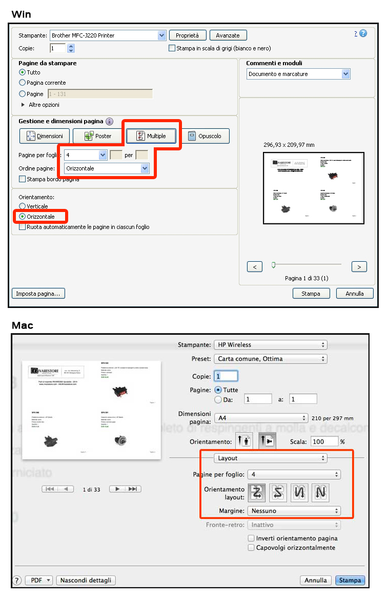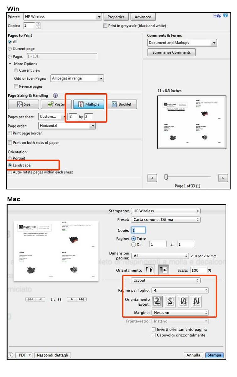 Consigliamo di impostare la stampante per la stampa di pagine multiple per foglio in modo da ridurre il catalogo cartaceo, l'assetto ottimale si ottiene impostando 4 pagine per foglio in dimensione orizzontale. Cliccare qui per le corrette impostazioni di stampa.
